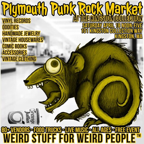 Plymouth Punk Rock Market will return to the Kingston Collection Mall, Saturday, April 18! Just 5 minutes from Mayflower Brewing. vinyl records, vintage goods & clothing, accessories, handmade jewelry, original art, oddities, and more. 80+ vendors Live music Craft beer by Widowmaker Brewing Food trucks Weird stuff for weird people. all ages, no cover.