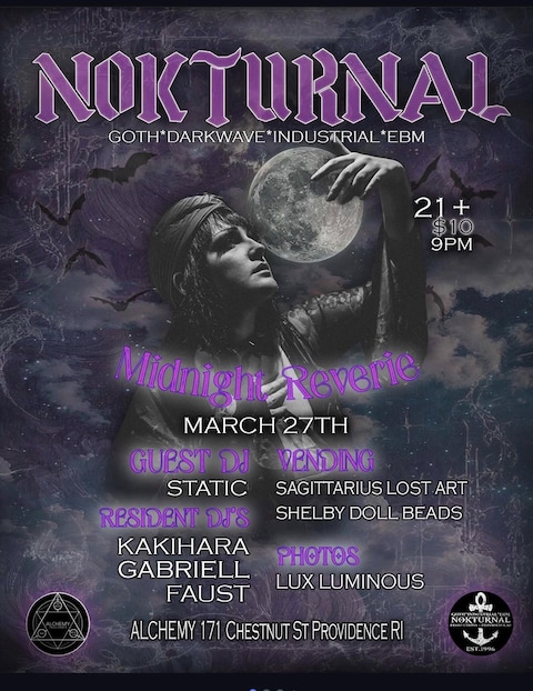 "Midnight Reverie" is a night of remembrance, reflection, and connection. Since 1996, Nokturnal has been more than a dance night, it's been a home. Over the years, many beloved members of our dark family have come and gone, but their presence still lingers in the music. SO LET'S DANCE FOR THEM!! GUEST DJ @j_static13 DJS @_hallofmirrors_ @dj.gabriell @dj.faust.pvd VENDING @sagittariuslostart @shelbys_emporium PHOTOS @Lux_Luminous DRESS CODE: Get creative and express yourself! Minimum ALL BLACK