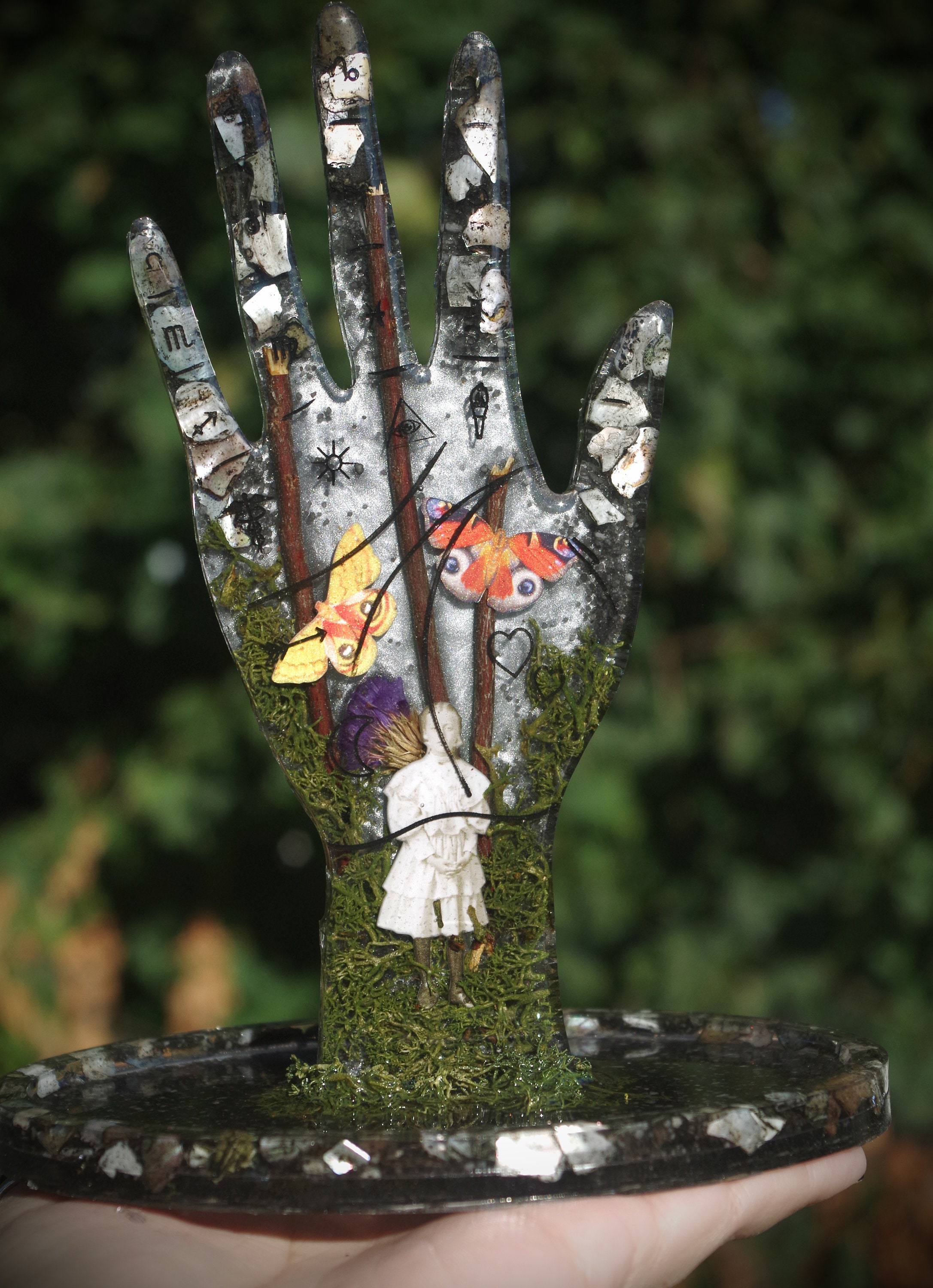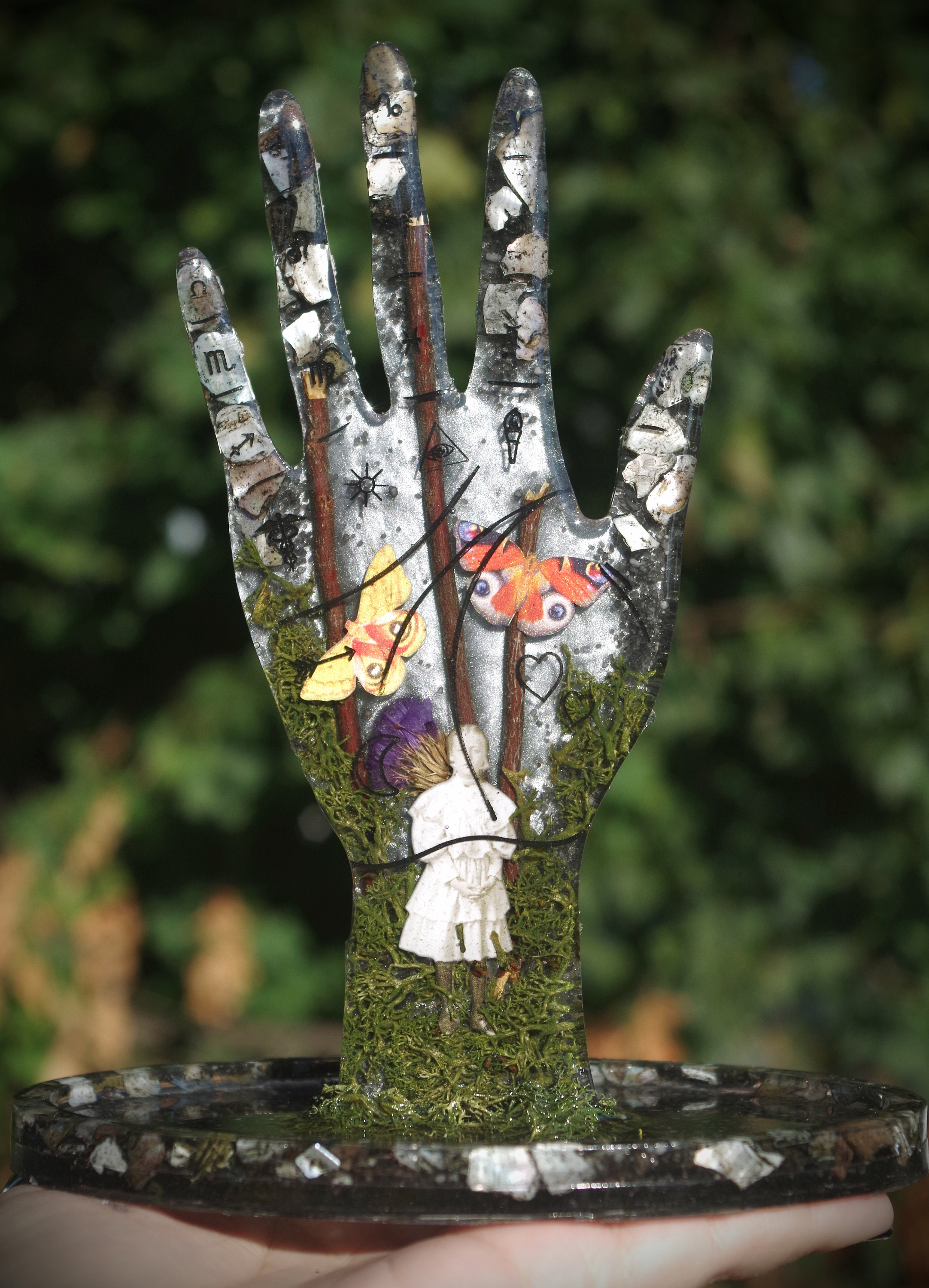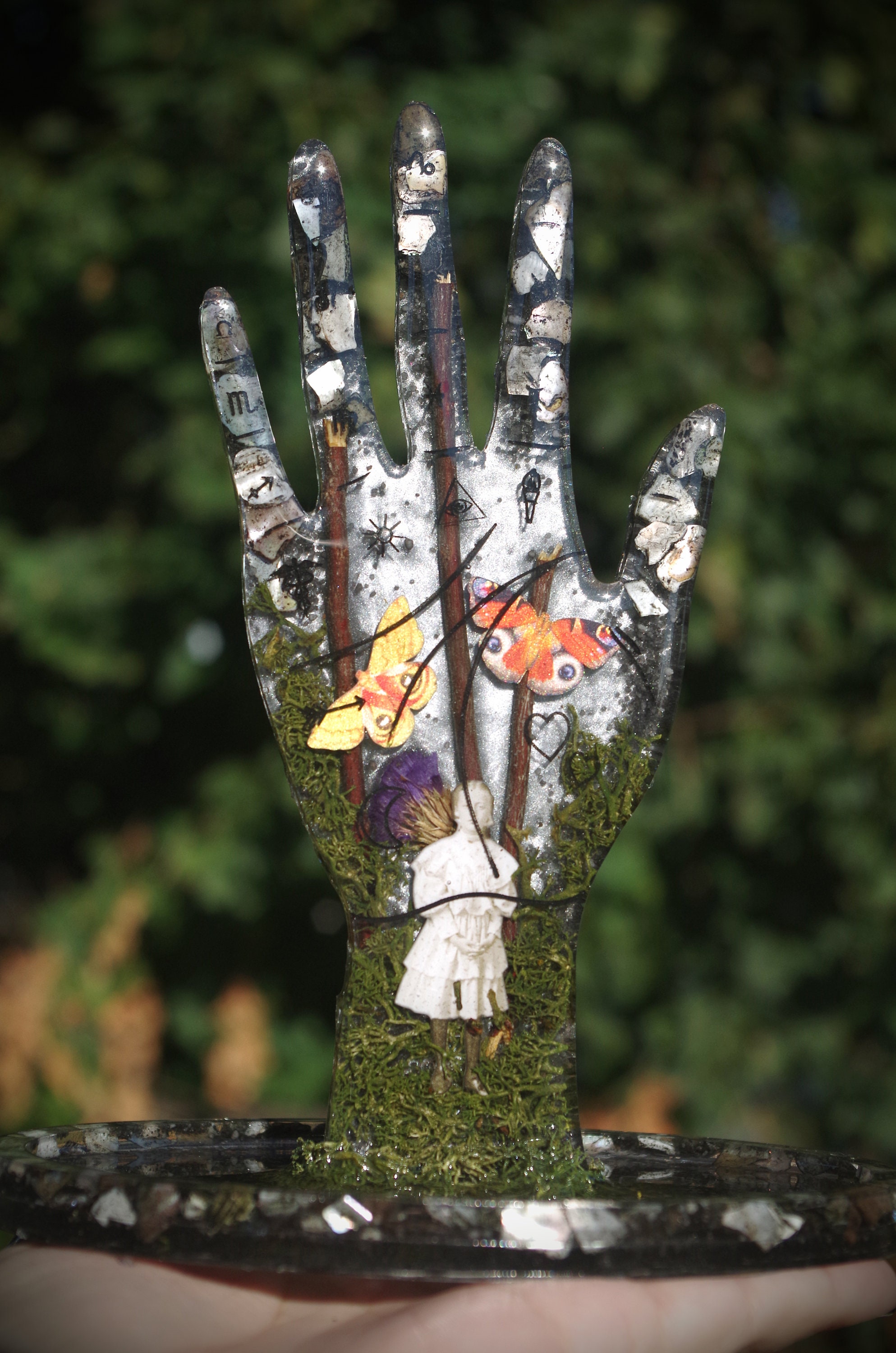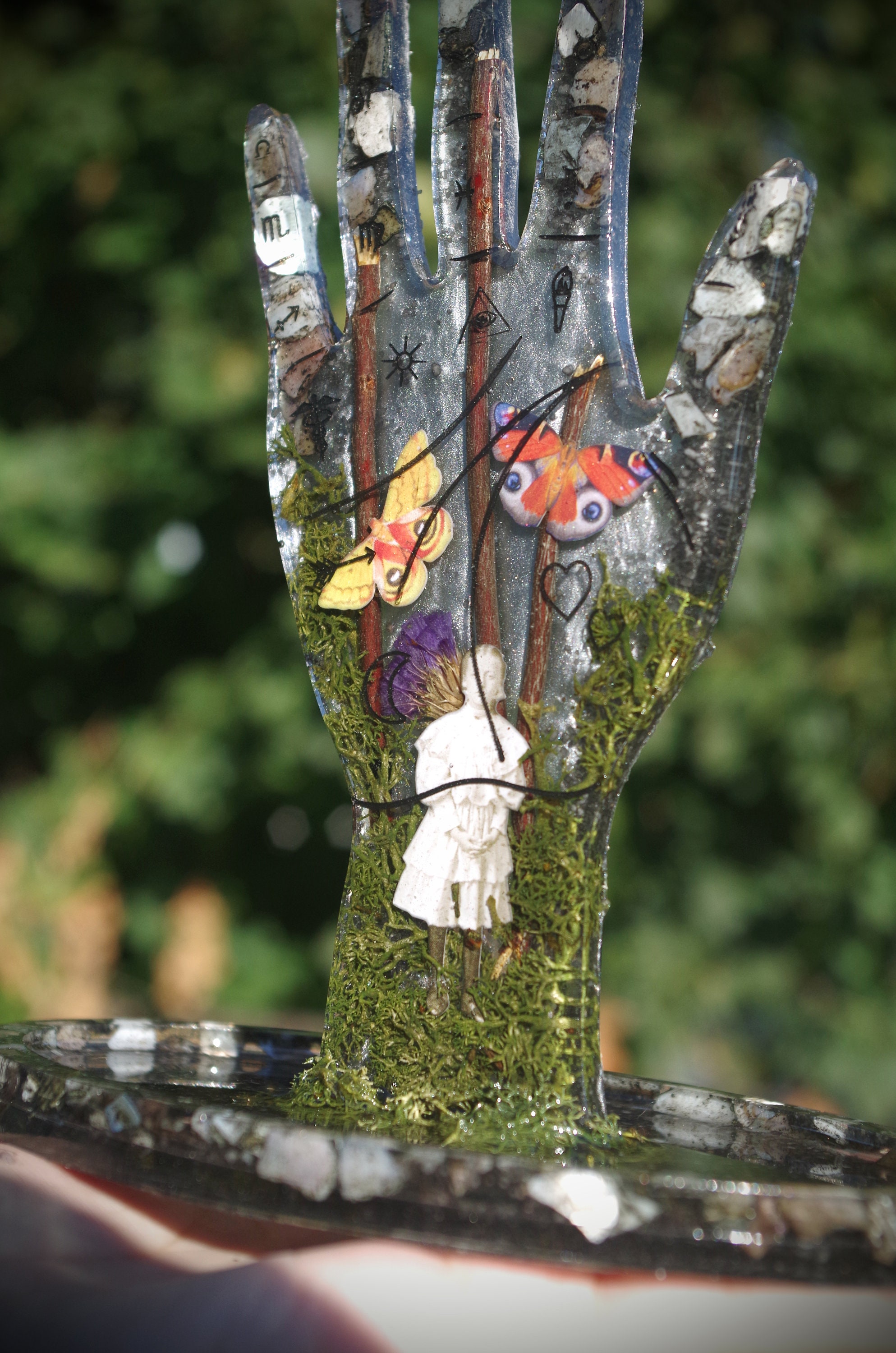 This piece is meticulously hand cast in resin. It features a ghostly girl emerging from the moss and fog with highly detailed paper butterflies. It also has seashells and dried botanicals. This is a gorgeous display for an altar or a vanity, it can hold rings on the top and whatever you would like in the tray at the bottom and there are rubber feet to prevent slipping or scratching on the bottom.