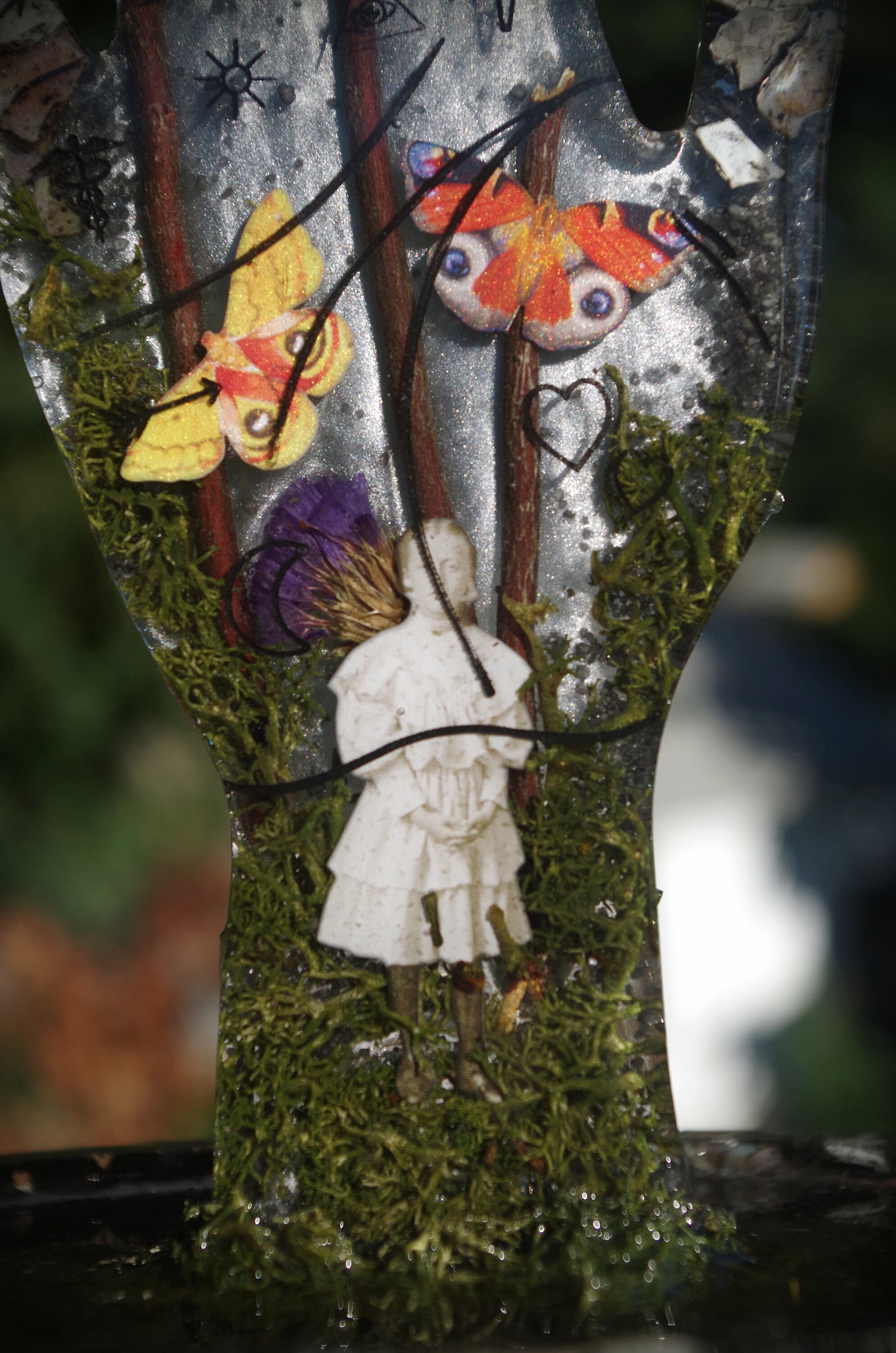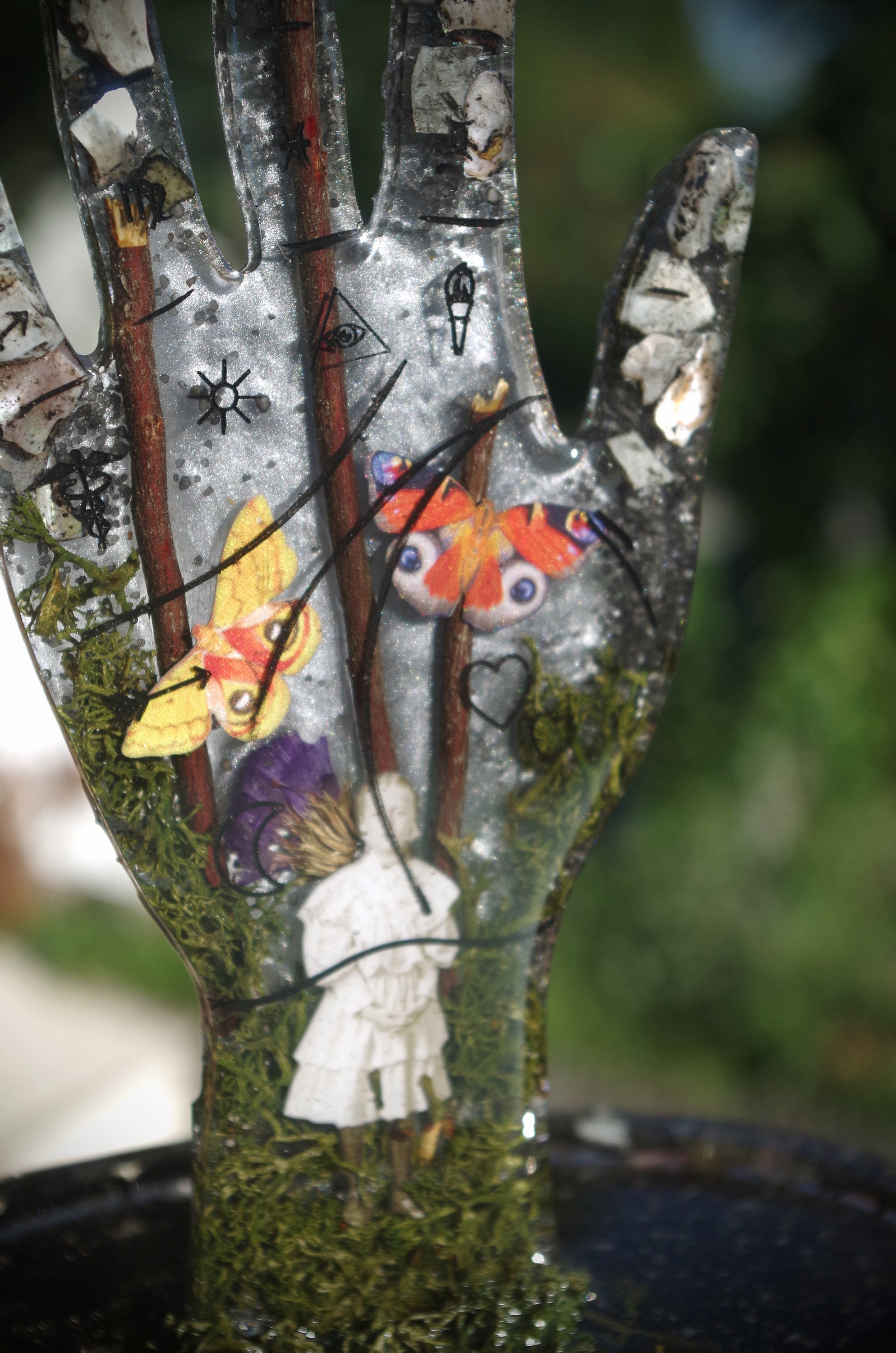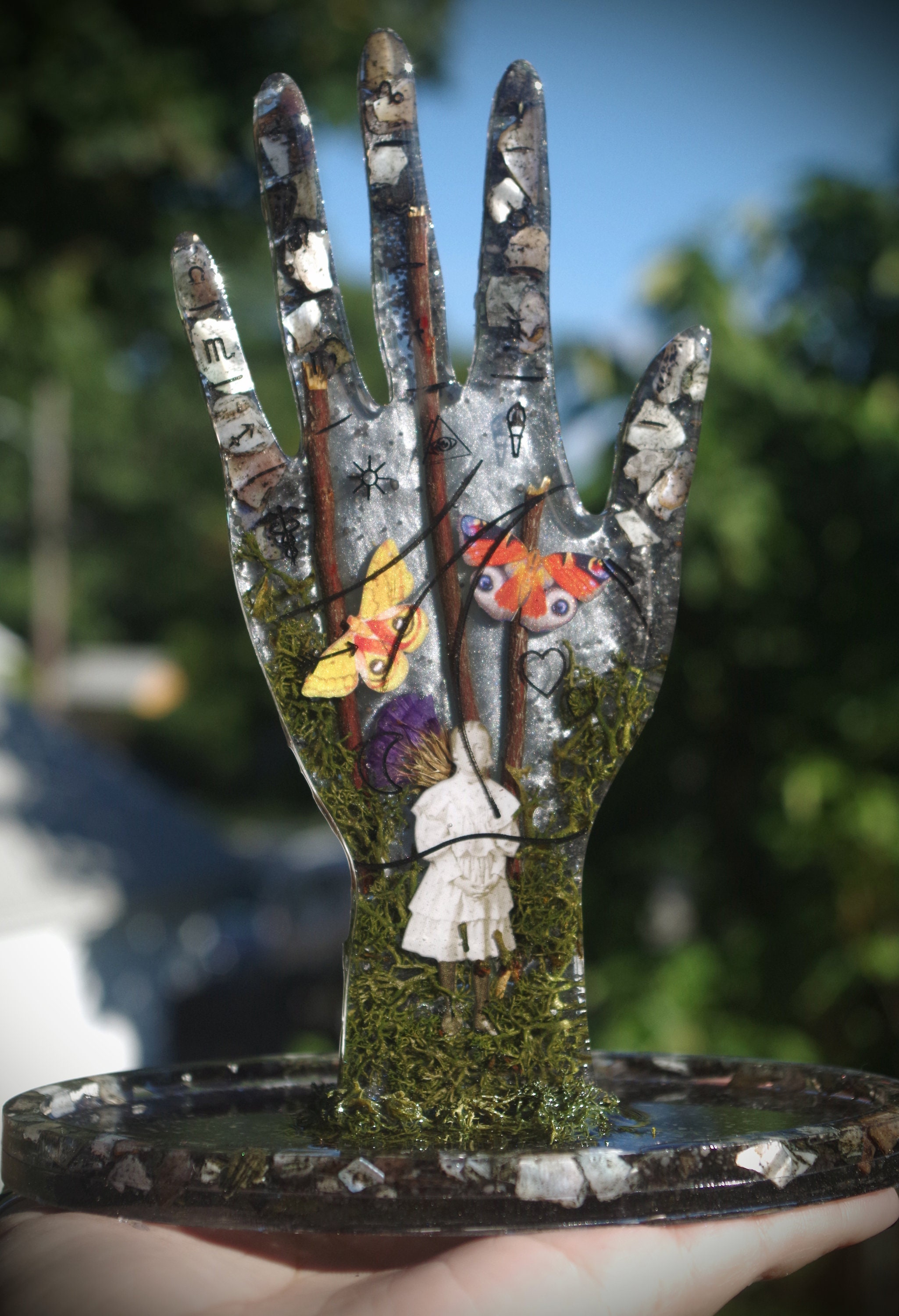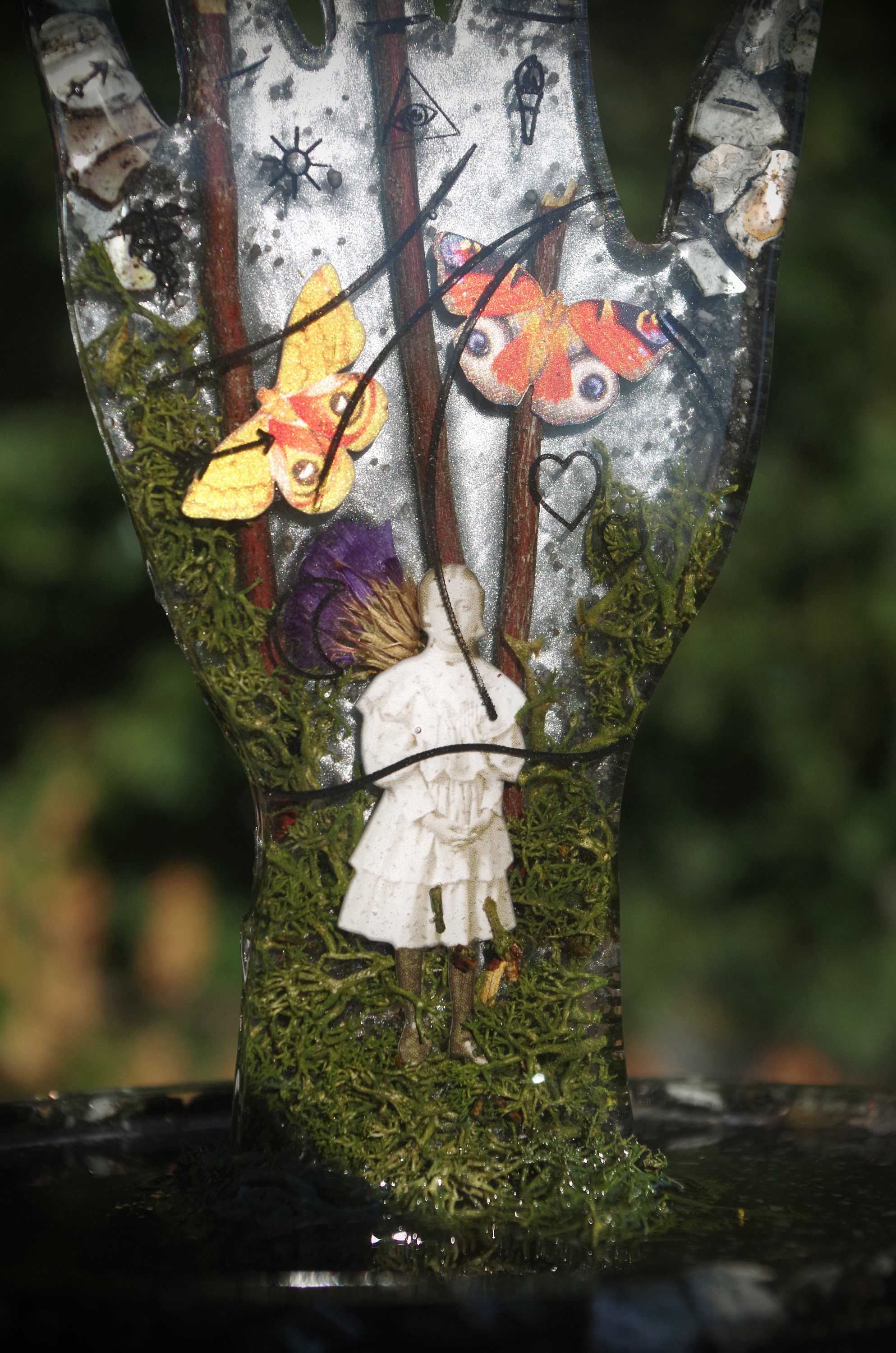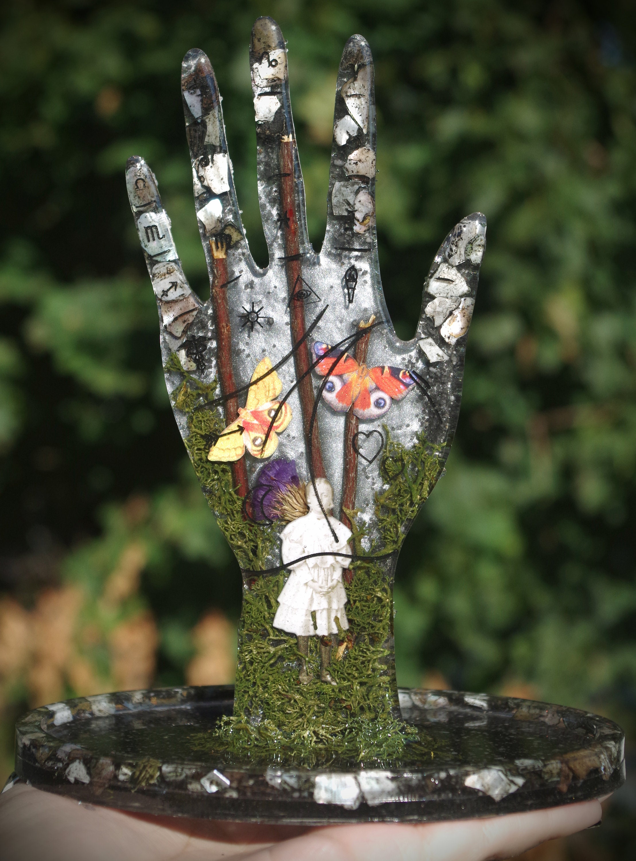 This piece is meticulously hand cast in resin. It features a ghostly girl emerging from the moss and fog with highly detailed paper butterflies. It also has seashells and dried botanicals. This is a gorgeous display for an altar or a vanity, it can hold rings on the top and whatever you would like in the tray at the bottom and there are rubber feet to prevent slipping or scratching on the bottom.