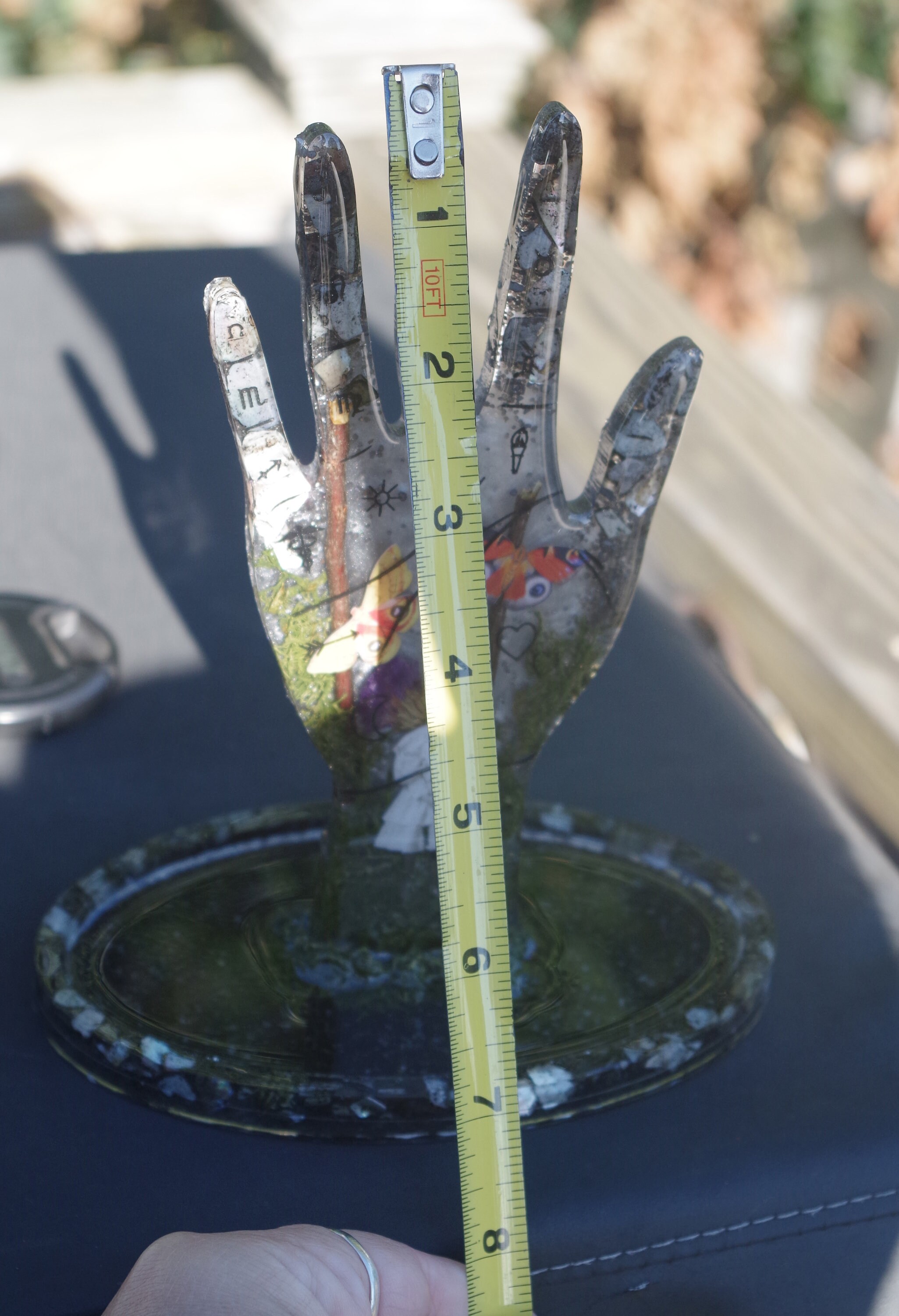 This is a Hoia Baciu Forest Collection Creepy Ghost Girl with Butterflies Botanical Hand Made Palmistry Ring Tree Display Jewelry Organizer. It measures about 7 inches from top to bottom.