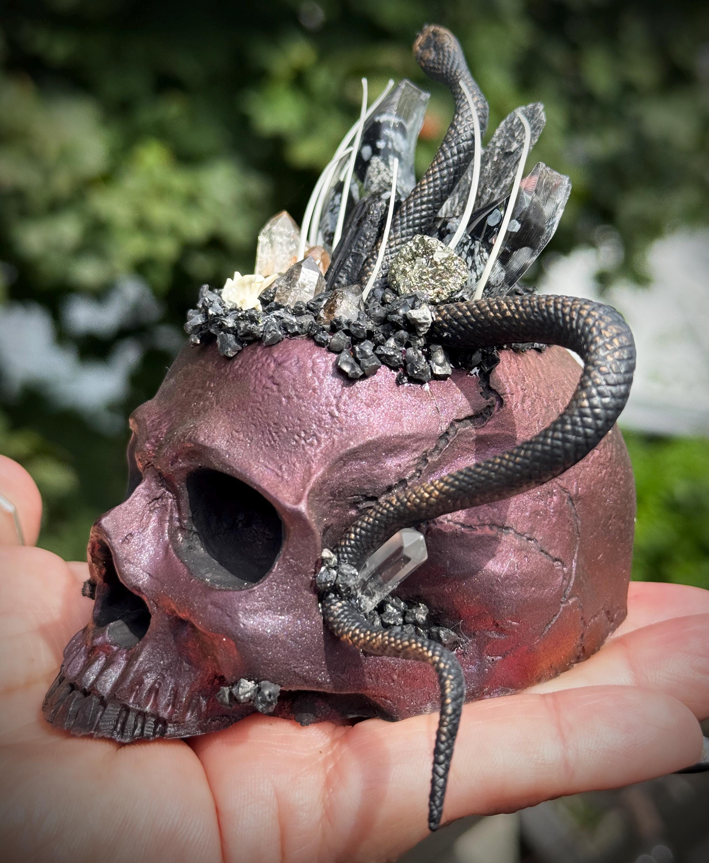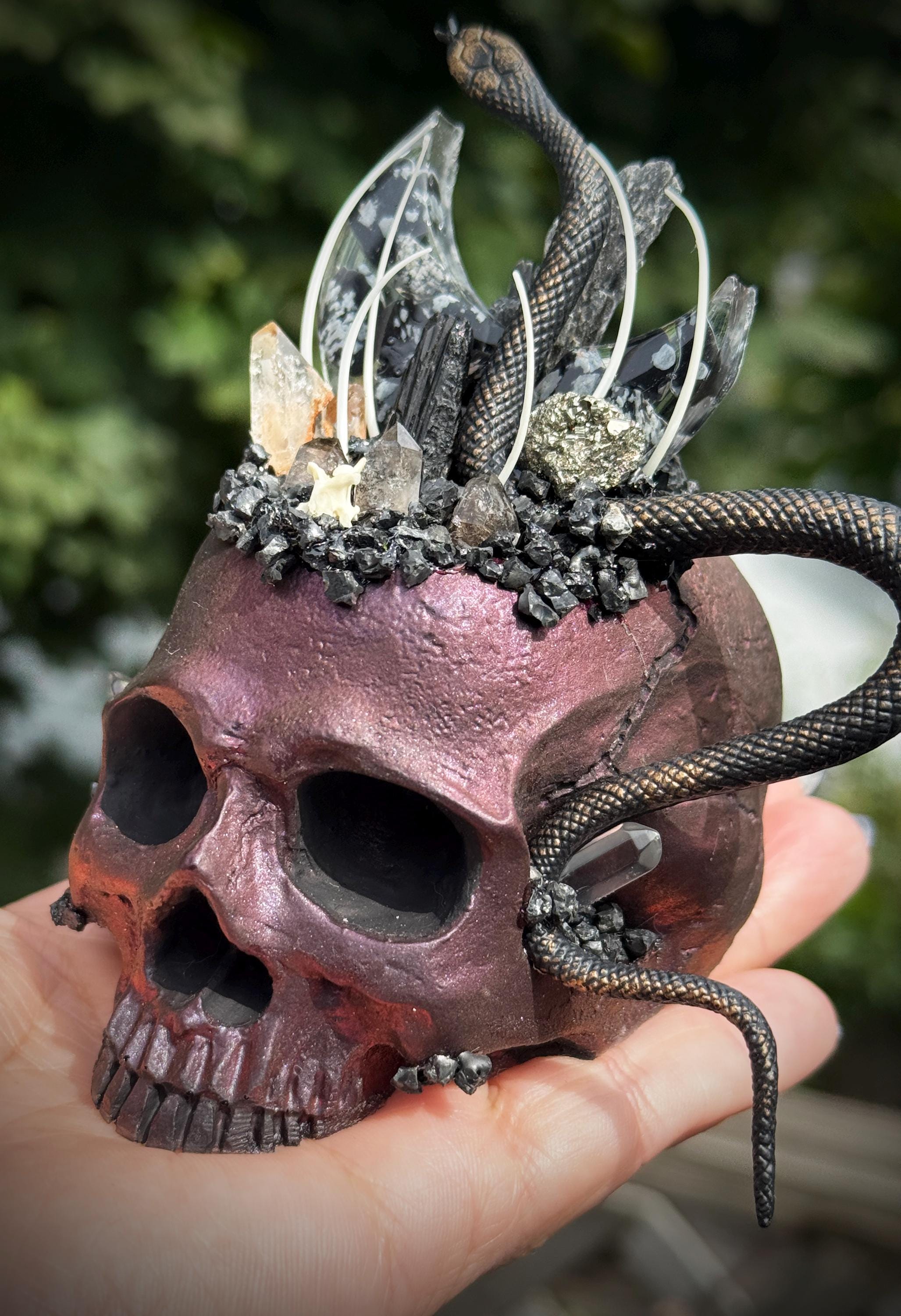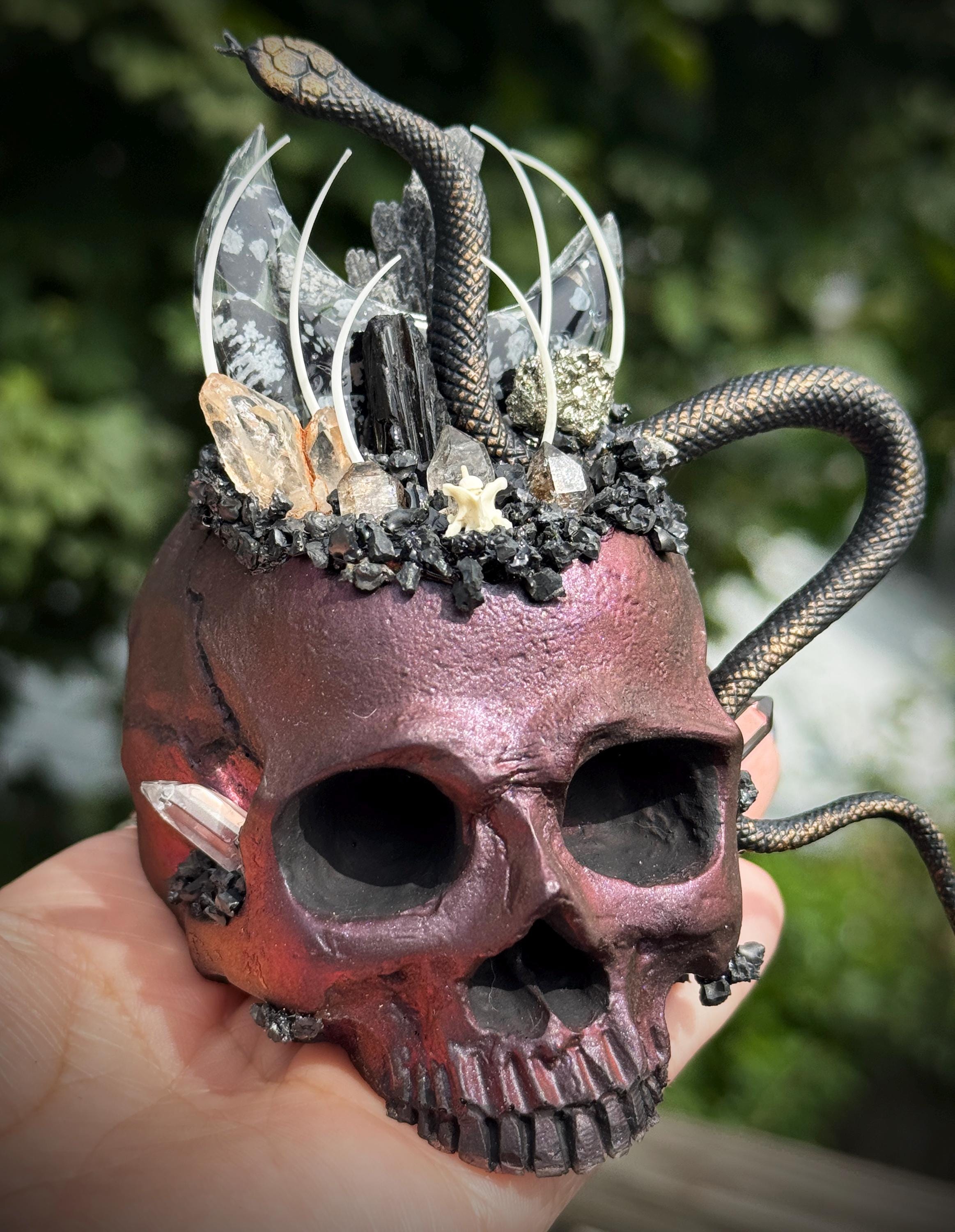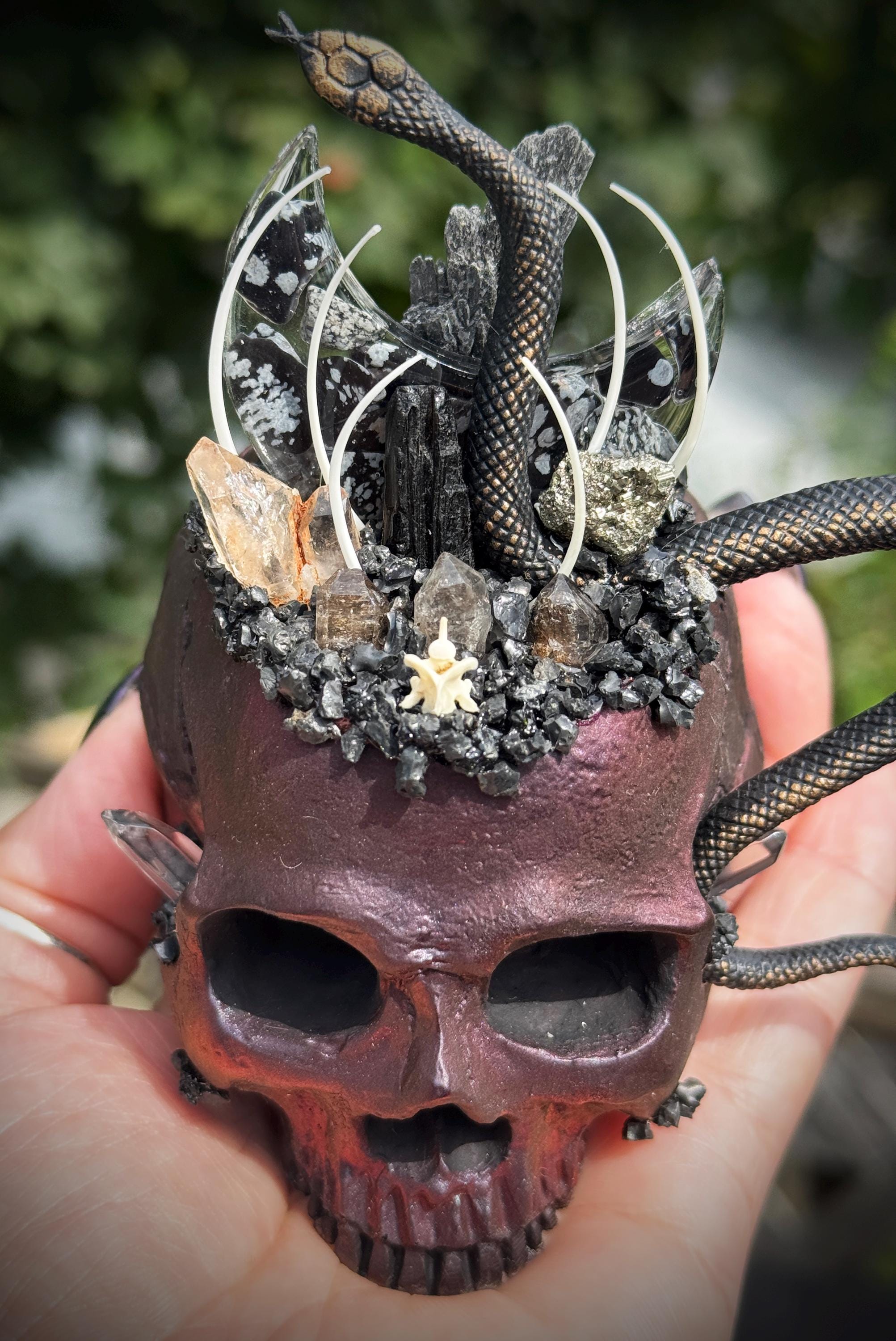 This is hand made and one of a kind! The skull is red/black. It is hand cast in resin and painted. It has an a snowflake obsidian filled resin moon with feather tourmaline, black tourmaline, pyrite, petroleum quartz, quartz, and herkimer diamonds. It has lava rock crusting with snake vertebrae and ribs! It has a flat bottom and is meant to sit on any flat surface. Please make sure you look through all of the photos, this piece has so much to offer!