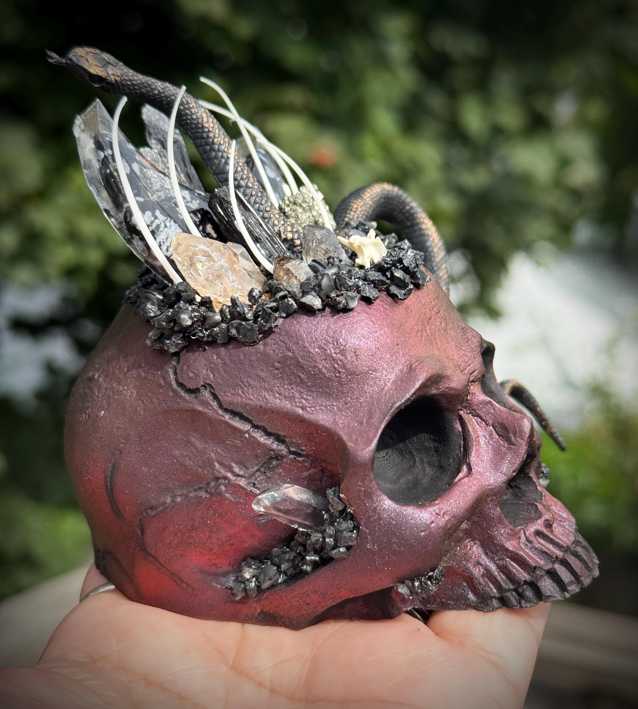 This is a Macabre Red/Black Hand Made Skull Crystal Garden Sculpture w/ Snake Vertebrae Snake Ribs Witchy Gothic Occult Altar/Table/Shelf Home Decor. It measures approximately 3.5 in in height, 2.5 in across, and is about 3 in deep. It's a beautiful addition to any room!