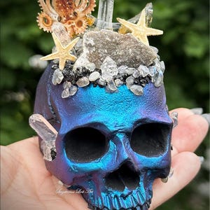 This is hand made and one of a kind! The multichrome skull has shifts of pink/orange/copper. It is hand cast in resin and painted. It has an a snowflake obsidian filled resin moon with quartz, amethyst, herkimer diamonds, and a rainbow moonstone sphere. It has a teeny super detailed resin coated seahorse with starfish, moss, and seashells. It's crusted with lava rocks and sand. It has a flat bottom and is meant to sit on any flat surface. Please make sure you look through all of the photos, this piece has so much to offer!