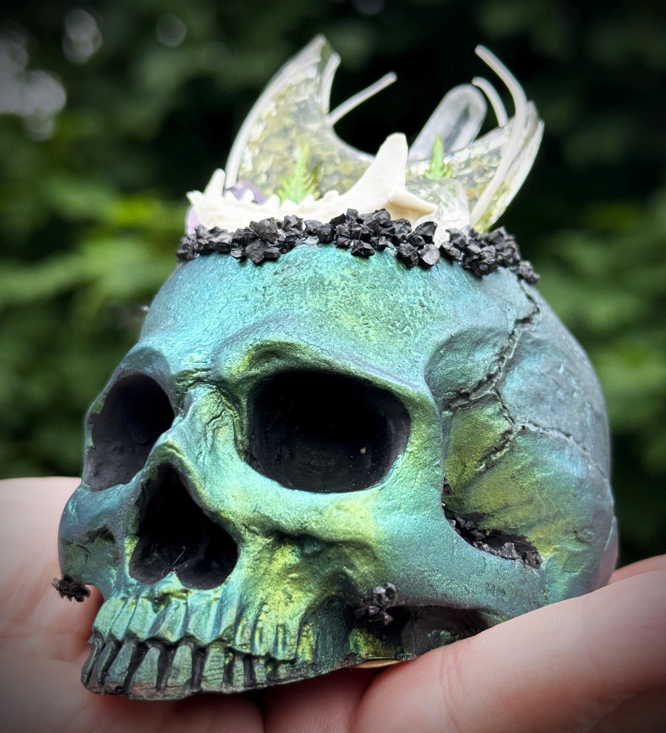 Macabre Green/Blue Hand Made Skull Crystal Garden Sculpture w/ Mink Jaw & Snake Ribs Witchy Gothic Occult Altar/Table/Shelf Home Decor