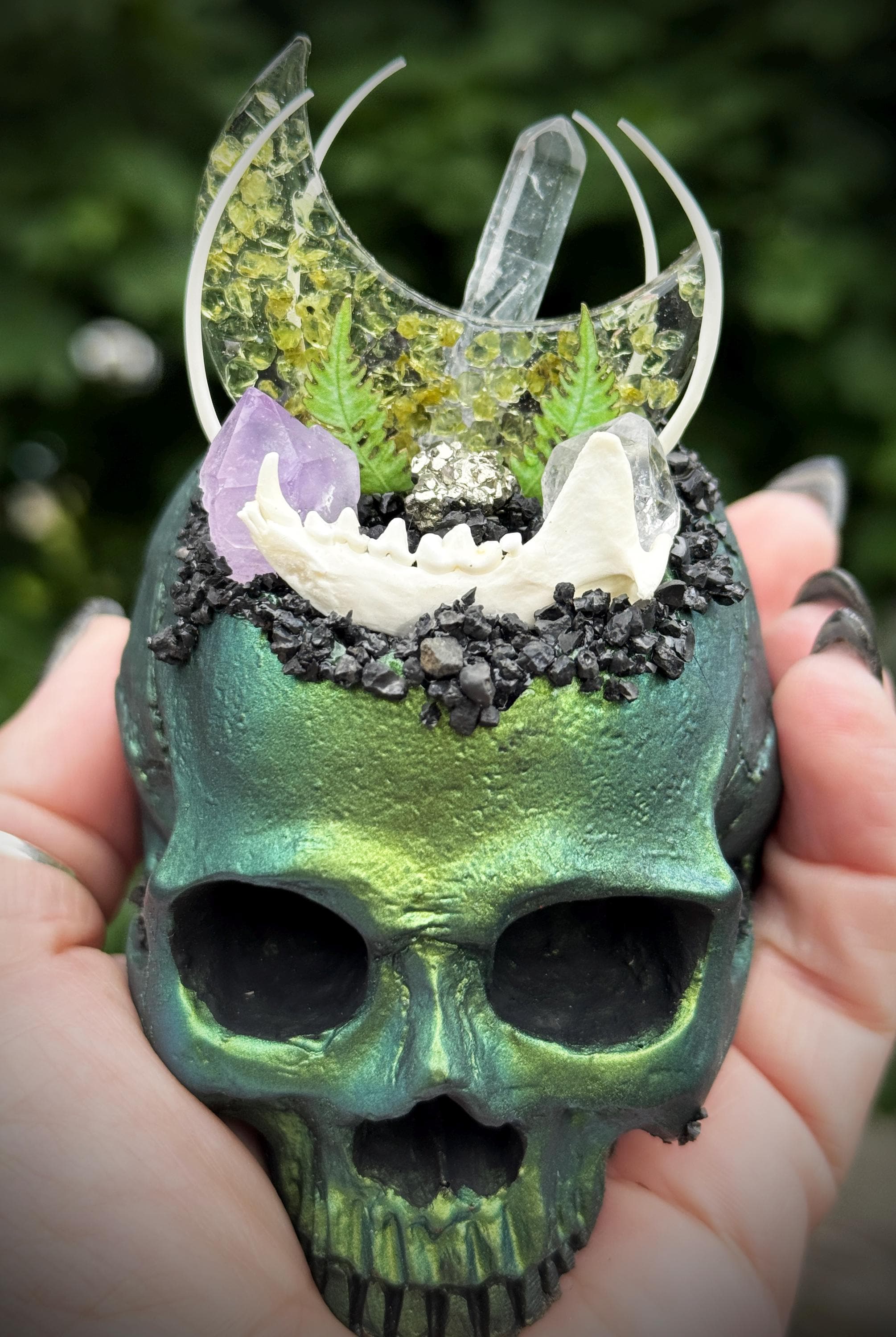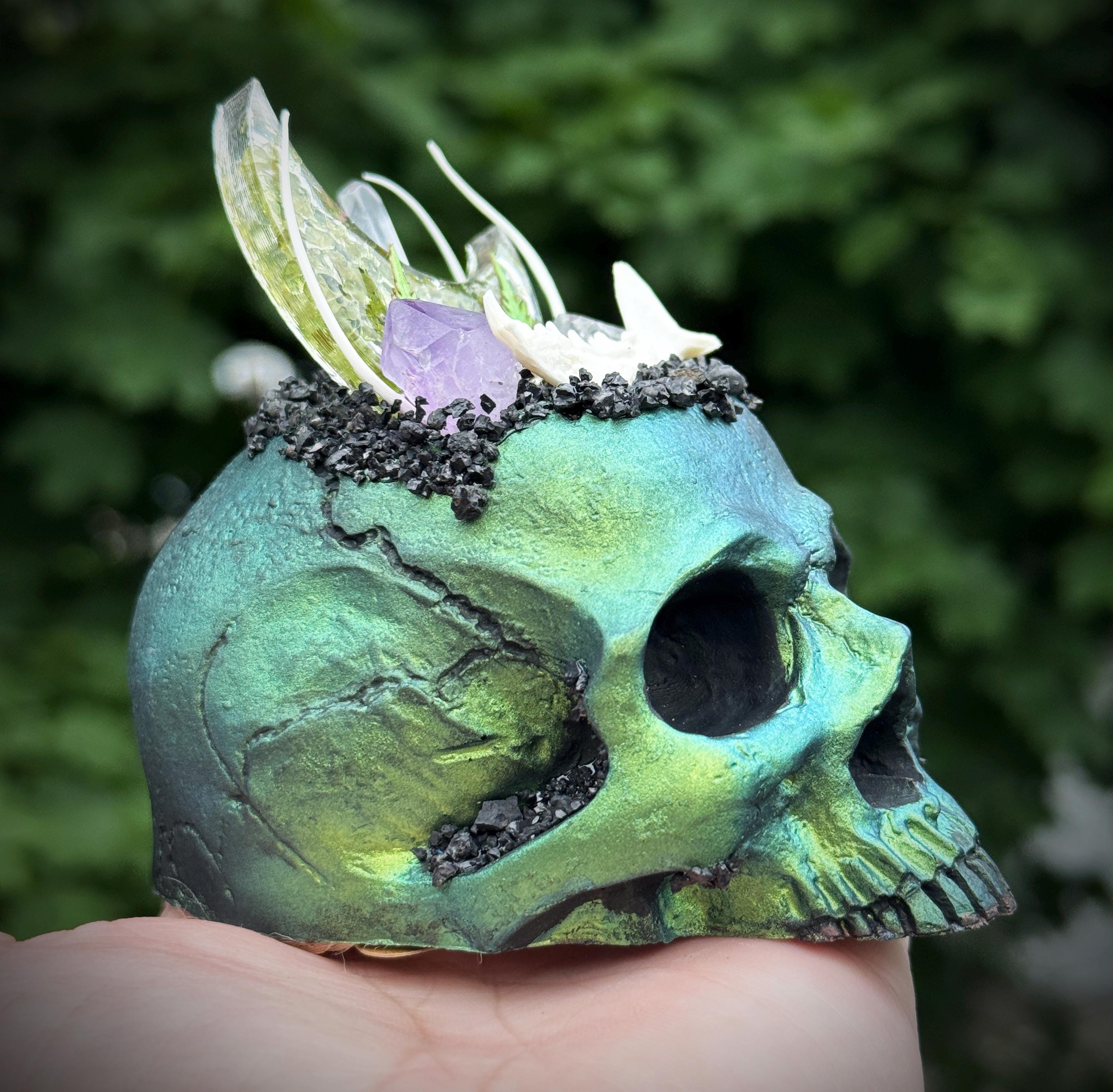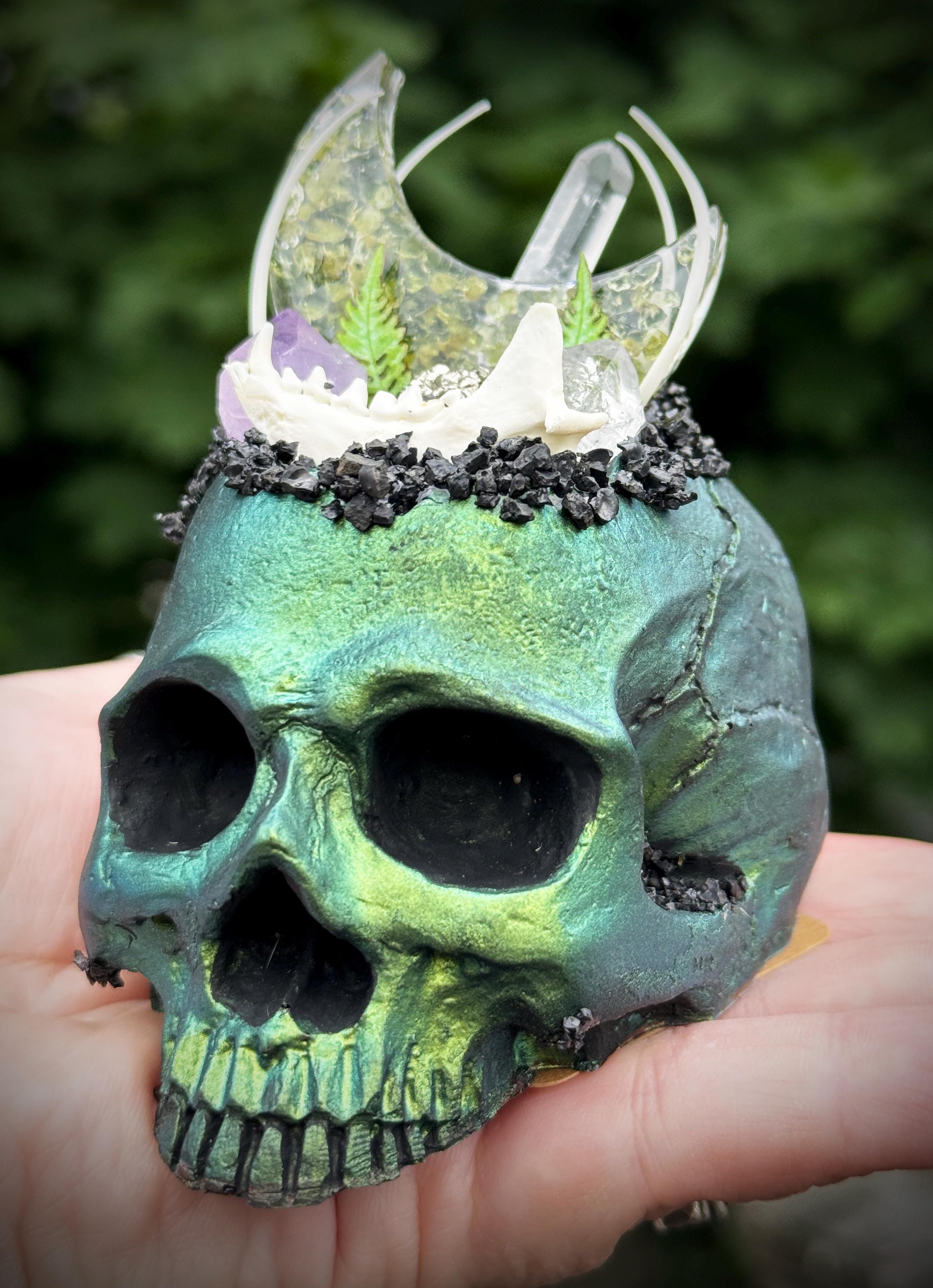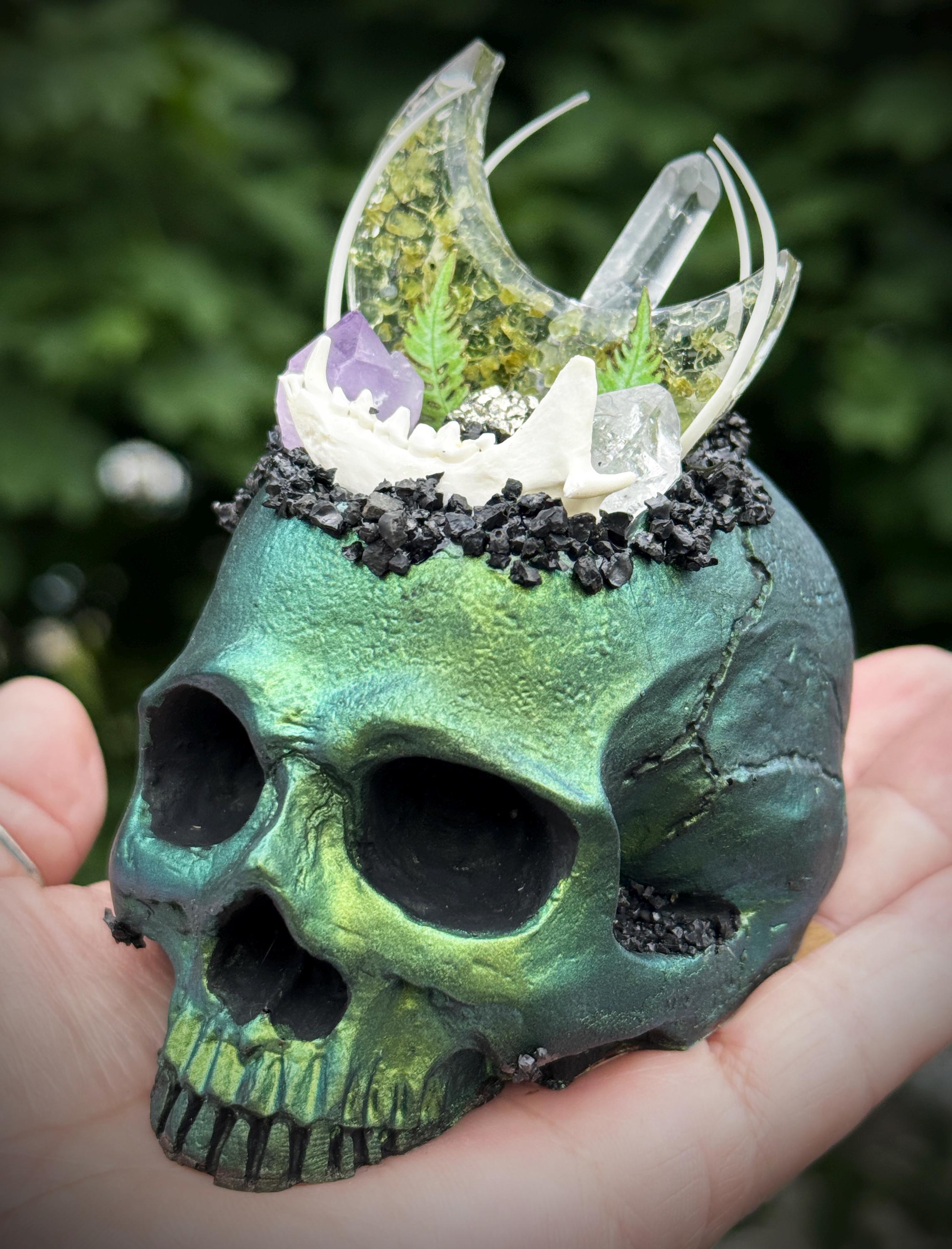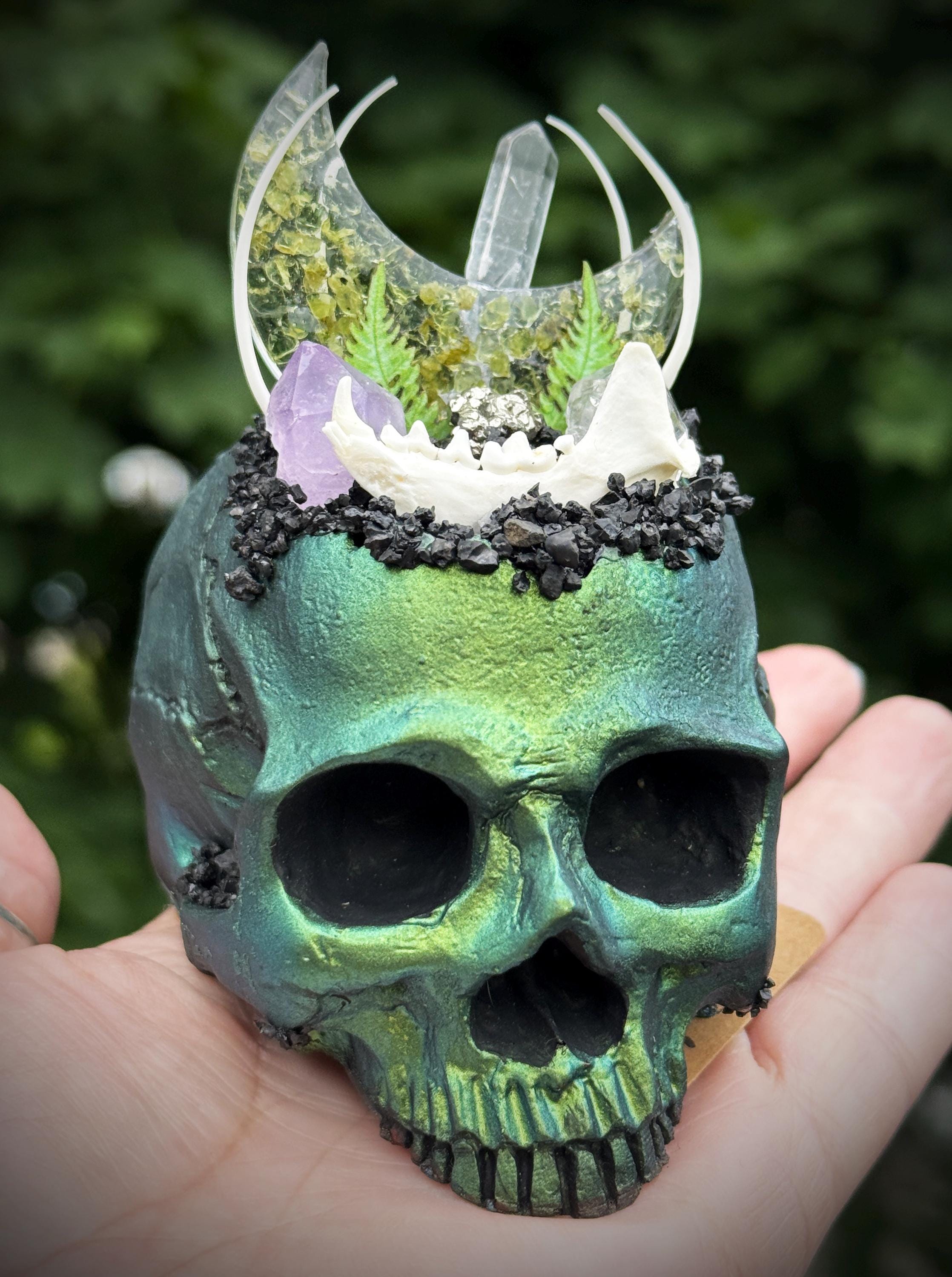 This is hand made and one of a kind! The multichrome skull has vibrant shifts of green, blue, purple. It is hand cast in resin and painted. It has an a peridot filled resin moon with quartz, amethyst, herkimer diamonds, and pyrite. It has lava rock crusting and a mink jaw and snake ribs with 2 tiny paper ferns. It has a flat bottom and is meant to sit on any flat surface. Please make sure you look through all of the photos, this piece has so much to offer!